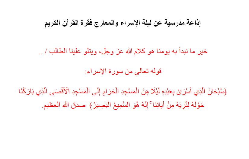 إذاعة مدرسية عن ليلة الإسراء والمعارج فقرة القرآن الكريم
