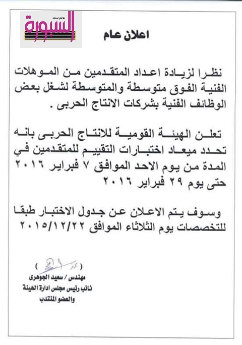 أعلنت الهيئة القومية للإنتاج الحربي، عن إجراء اختبارت التقييم للمتقدمين لوظائف الهيئة المعلن عنها، للعمل في مصانع الهيئة المنتشرة في عدد من المحافظات، في الفترة من 7 فبراير 2016 حتى 29 من الشهر ذاته.