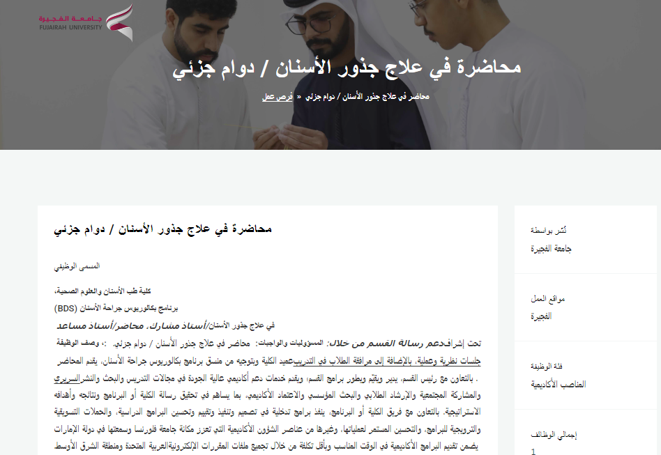 وظيفة جامعة.. تعلن كلية طب الأسنان والعلوم الصحية في جامعة الفجيرة عن إتاحة فرصة أكاديمية متميزة لشغل وظيفة محاضر علاج جذور الأسنان بنظام الدوام الجزئي، وذلك ضمن برنامج بكالوريوس جراحة الأسنان BDS، في إطار سعيها المستمر لتعزيز جودة التعليم الطبي ورفع كفاءة المخرجات الأكاديمية والسريرية.