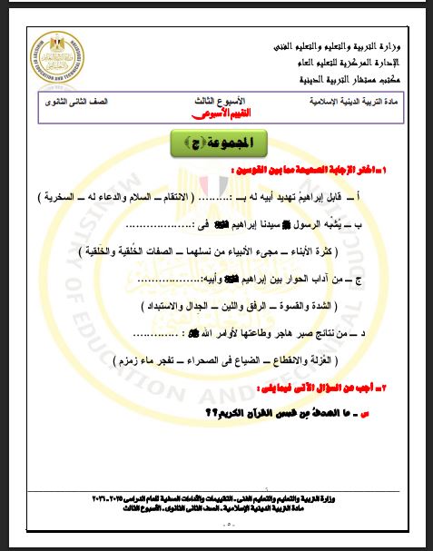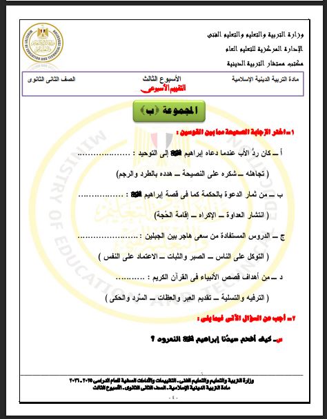 - الأسبوع الثالث تقييم ثانية ثانوي التربية الاسلامية