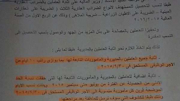 اثابة جميع العاملين بالمديرية والمأموريات التابعة لها بما يوازي 10 أيام من الاجر الوظيفي المستحق في 2015/9/30، وإثابة إضافية للعاملين بالمديرية والمأموريات التابعة لها التي حققت نسبة الأدنى من الحصيلة عن الفترة من يوليو حتى سبتمبر 2015 وبذات نسب الايام الموضحة قرين كل مأمورية منسوبة إلى الأجر الوظيفي المستحق فى 20 /9 /2015 وذلك طبقا للكشوف التي سوف ترسل للمنطقة بعد مراجعتها.