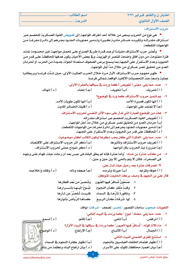 امتحان اللغة العربية عن مقرر شهر فبراير بالاجابات لـ الصف الأول الثانوي، للعام الدراسي الجاري 2025-2026، في مراجعات نهائيه وتحميل روشتة التفوق لن يخرج عنها امتحان اللغة العربية تضمن لك التفوق لـ الصف الأول الثانوي، حيث يواصل موقع السبورة نشر مراجعة ليلة الامتحان من خلال تحميل روشتة التفوق لن يخرج عنها امتحان اللغة العربية تضمن لك التفوق لـ الصف الأول الثانوي، من خلال مراجعات نهائيه، واستعراض جميع نظام أسئلة امتحانات اللغة العربية، وشرح مبسط، واستعراض روشتة التفوق لن يخرج عنها امتحان اللغة العربية تضمن لك التفوق لـ الصف الأول الثانوي، عن طريق نشر العديد من الامتحانات، لطلاب وطالبات الصف الأول الثانوي، في مراجعات نهائيه، لن يخرج عنها امتحان آخر العام، ومن خلال متابعة مراجعات نهائيه أعدها خبراء المادة في وزارة التربية والتعليم.