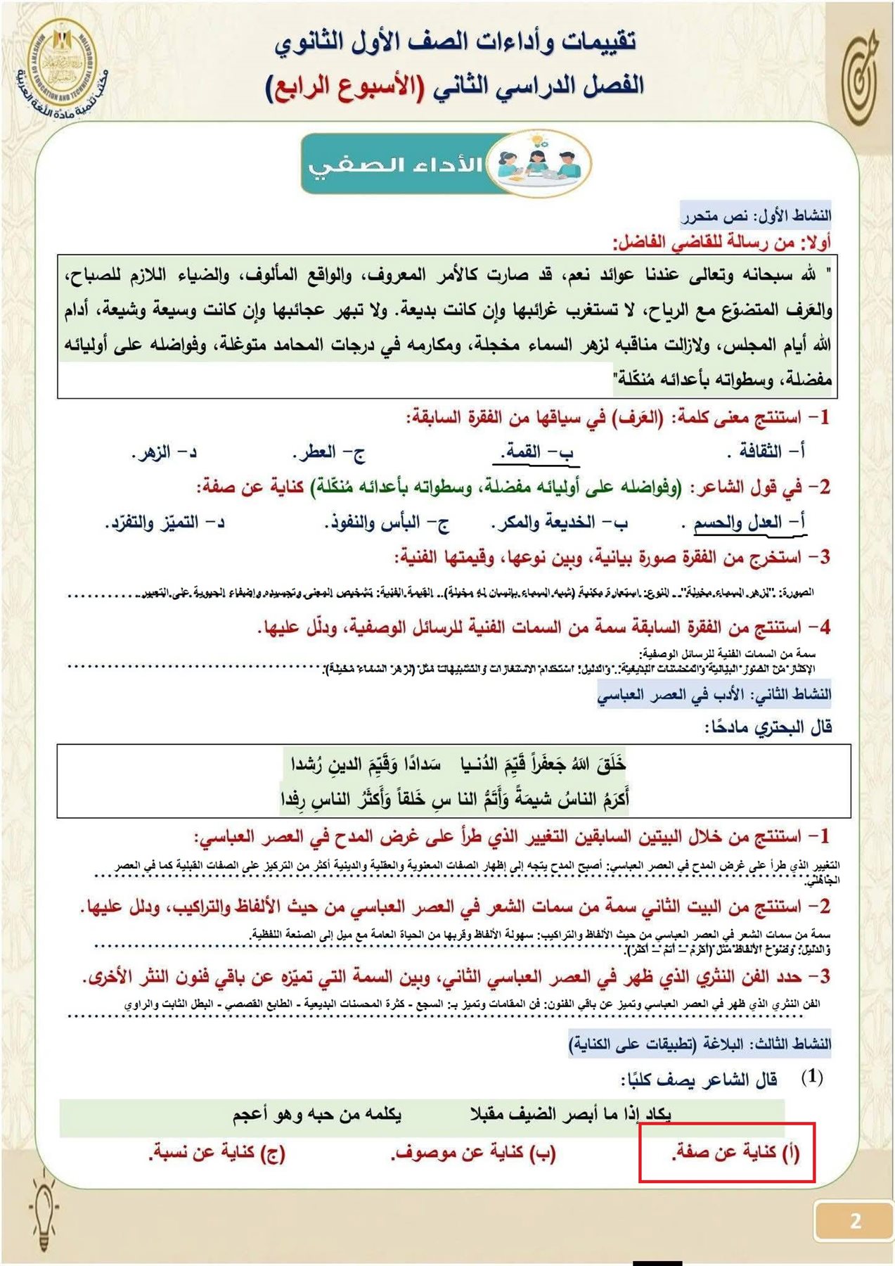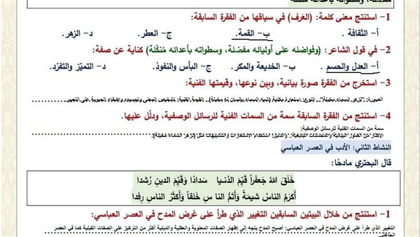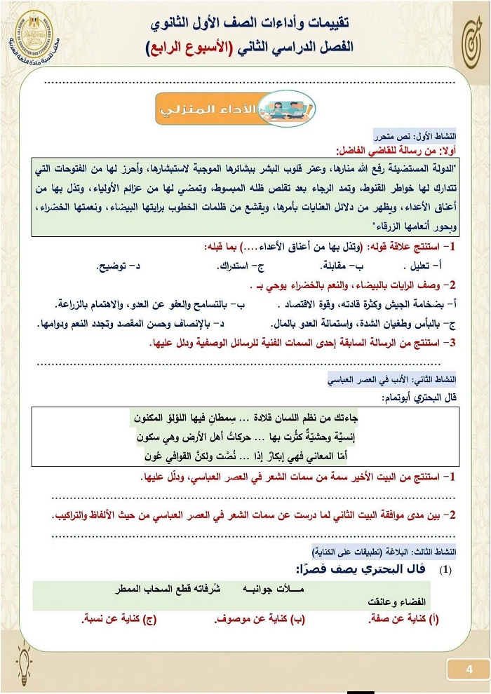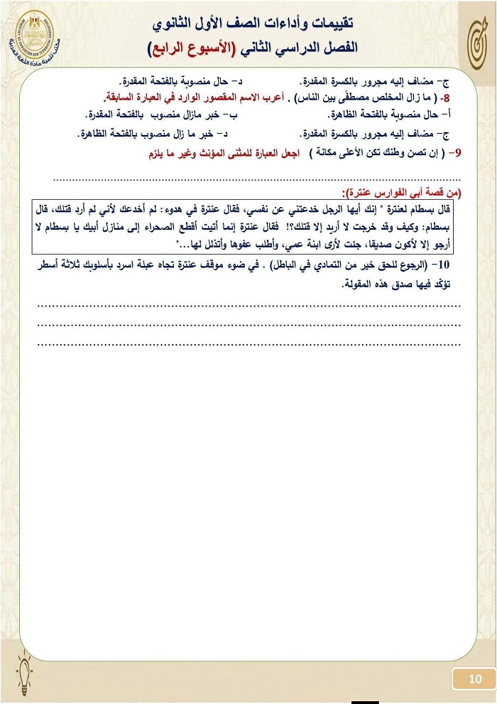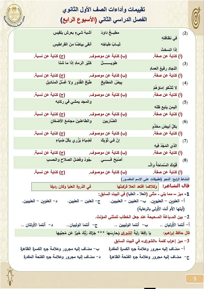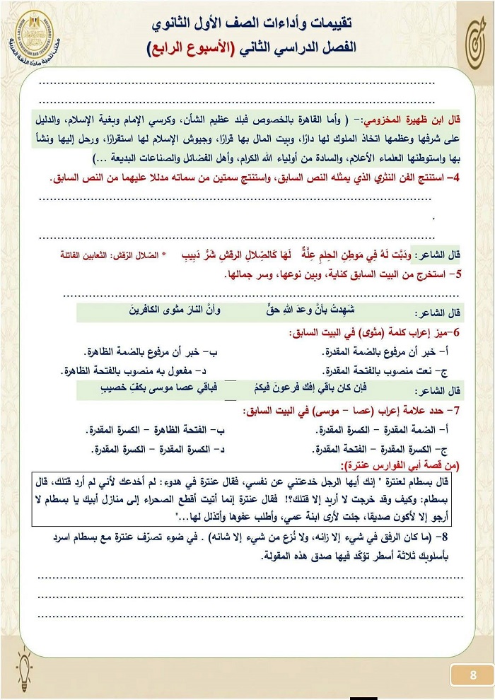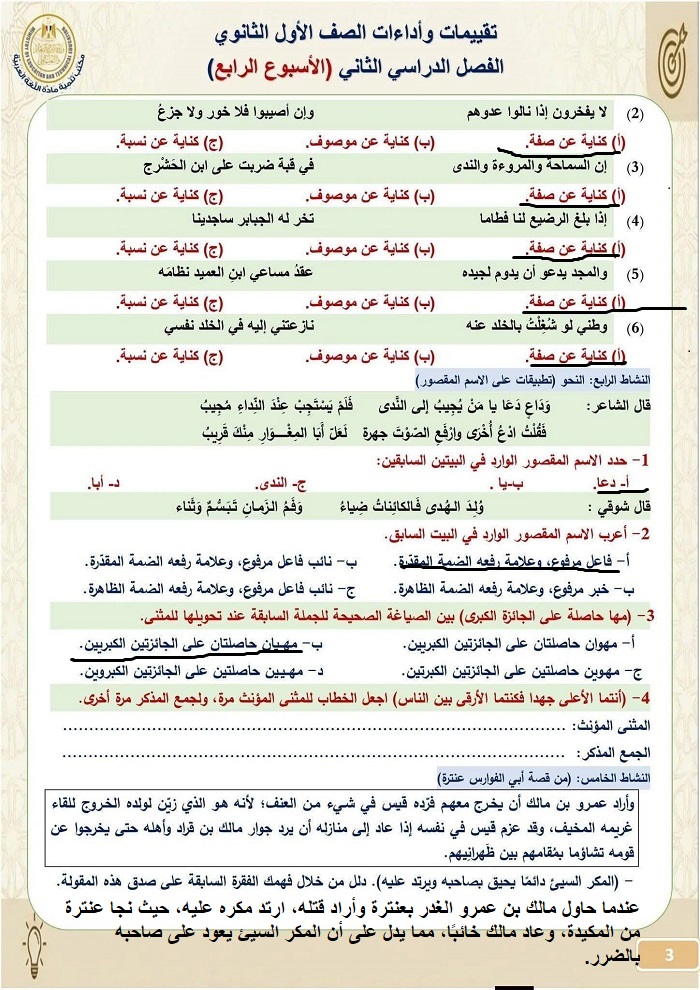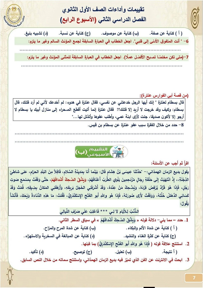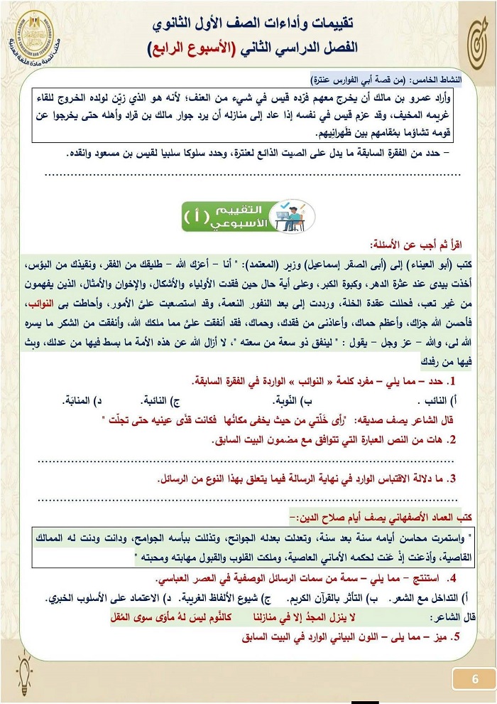 - تقييمات اللغة العربية أولى ثانوي الترم الثاني 2026