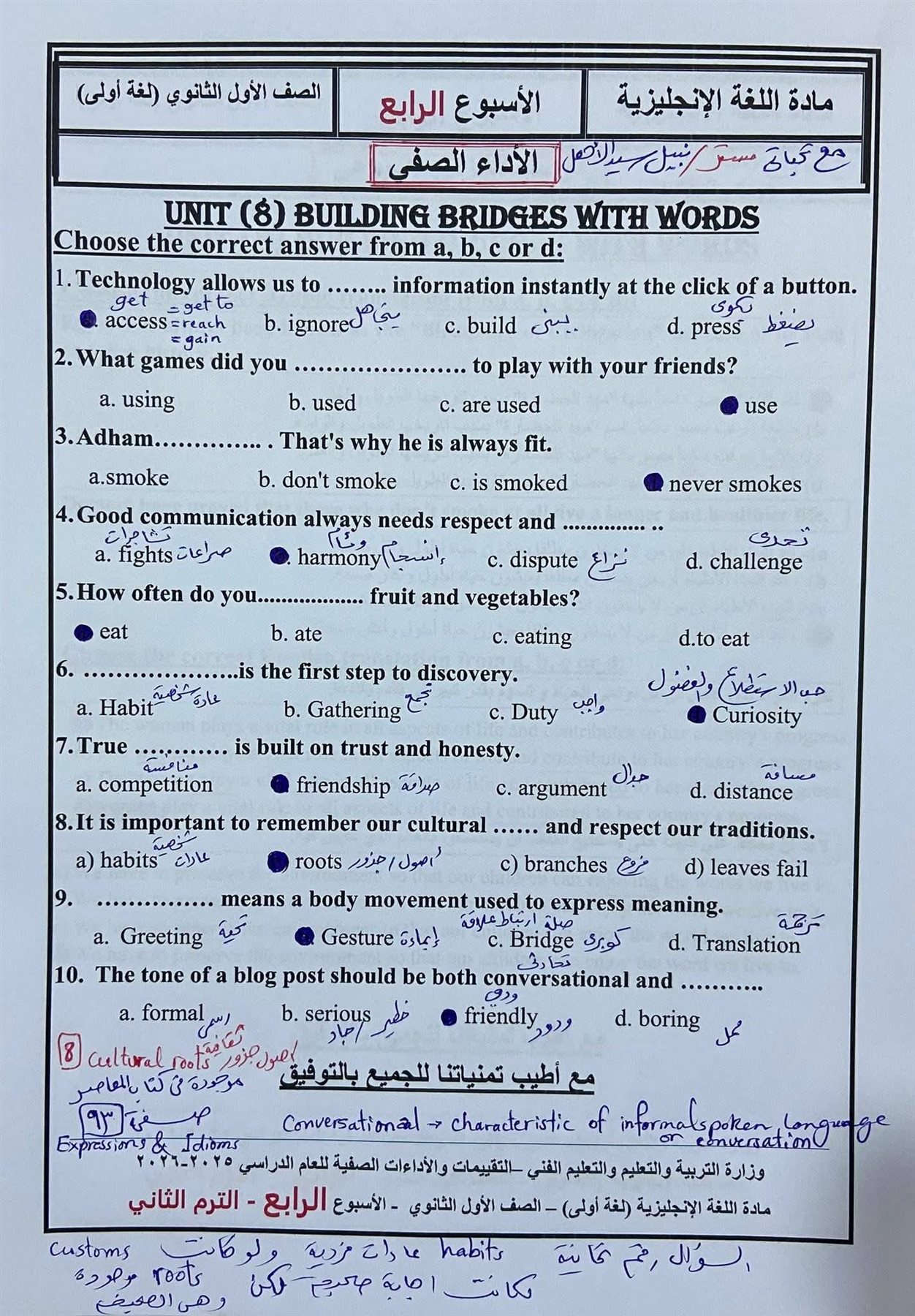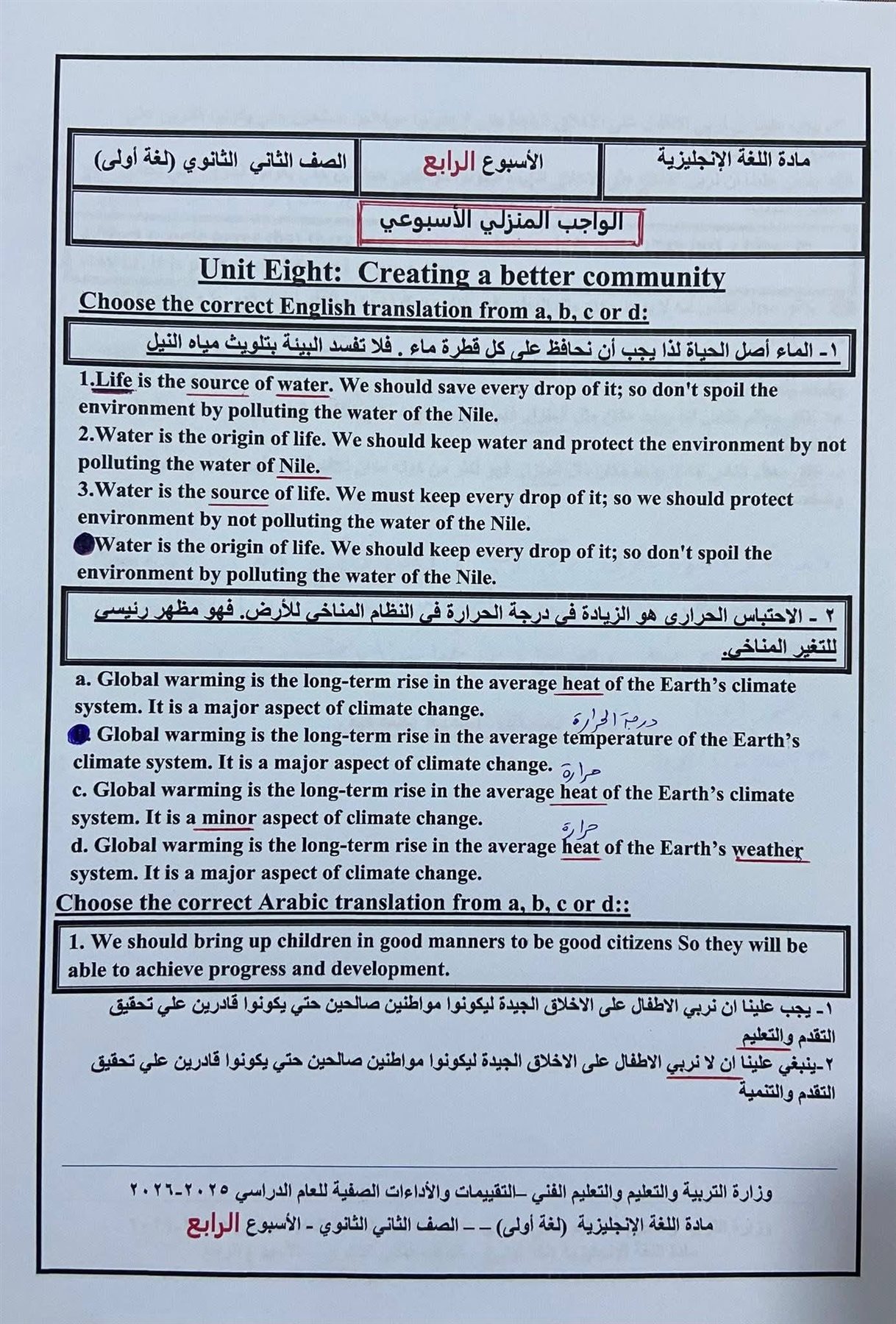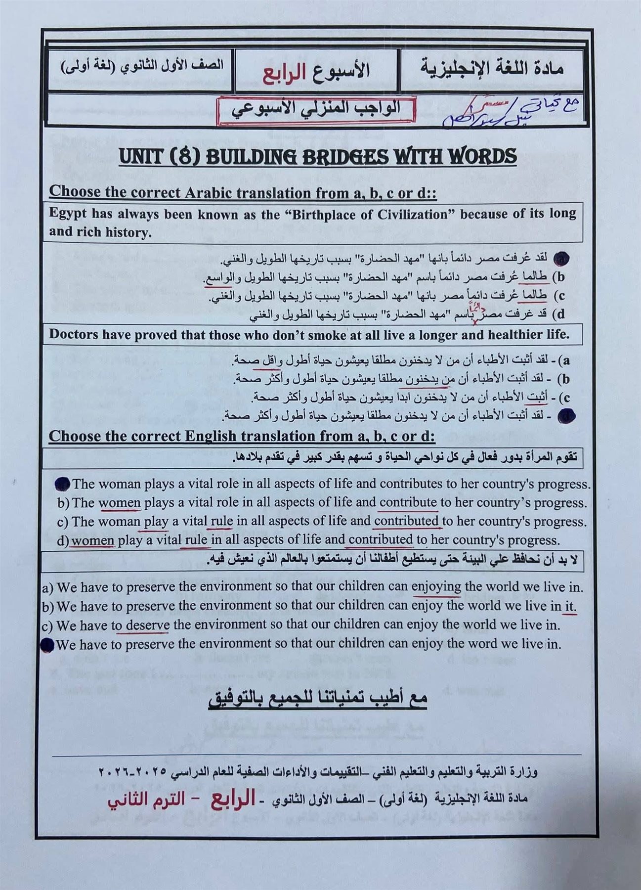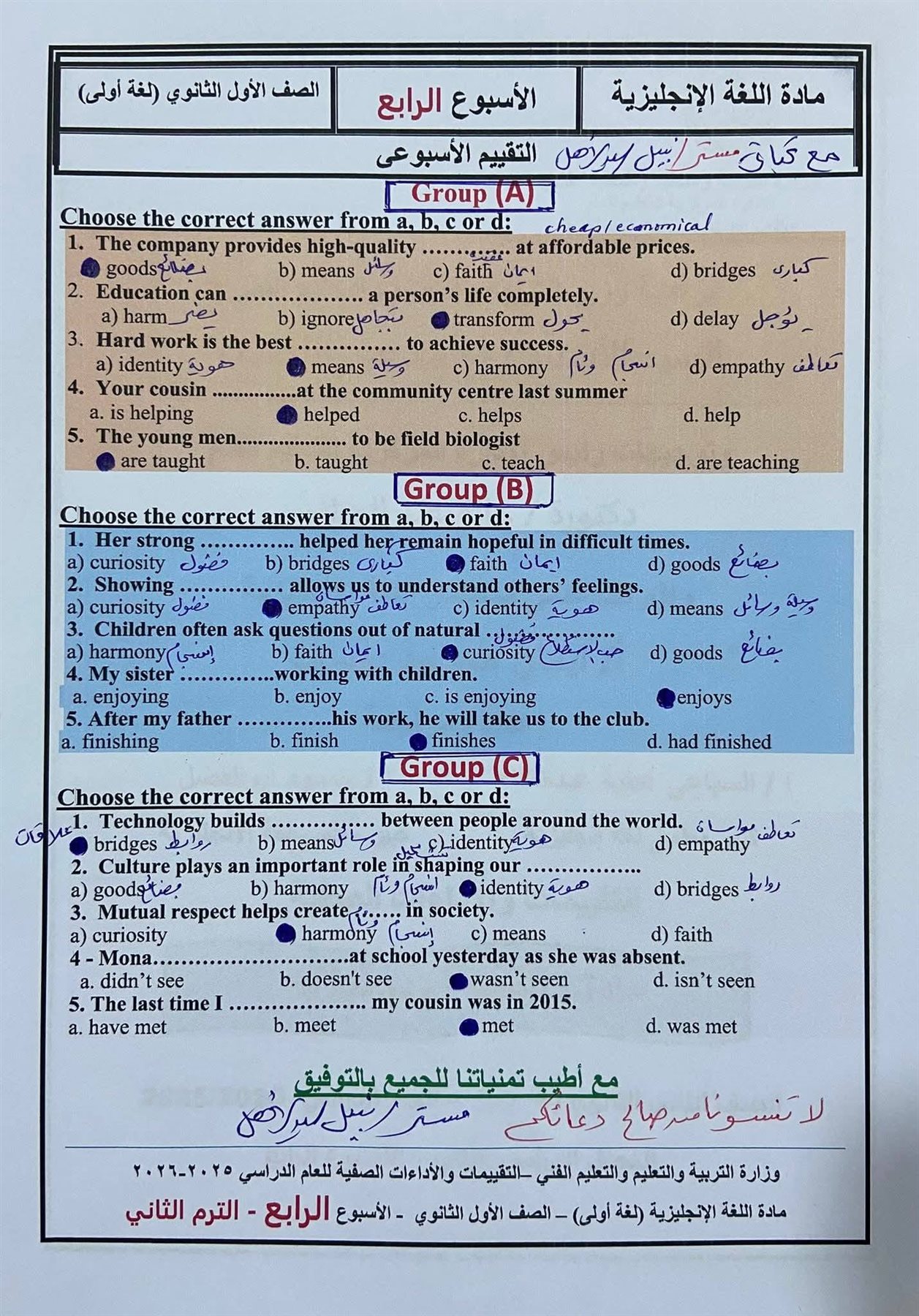 أسئلة تقييمات الأسبوع الرابع إنجليزي بالاجابات أولى ثانوي ترم ثاني