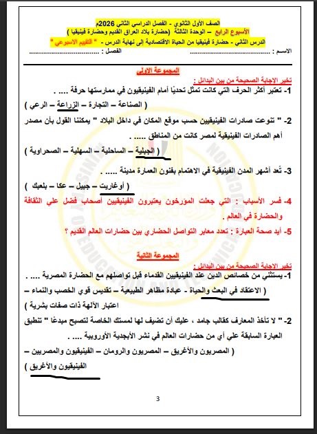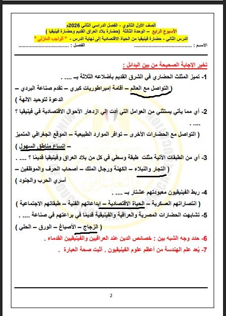 - أسئلة التاريخ أولى ثانوي الأسبوع الثالث 2026
