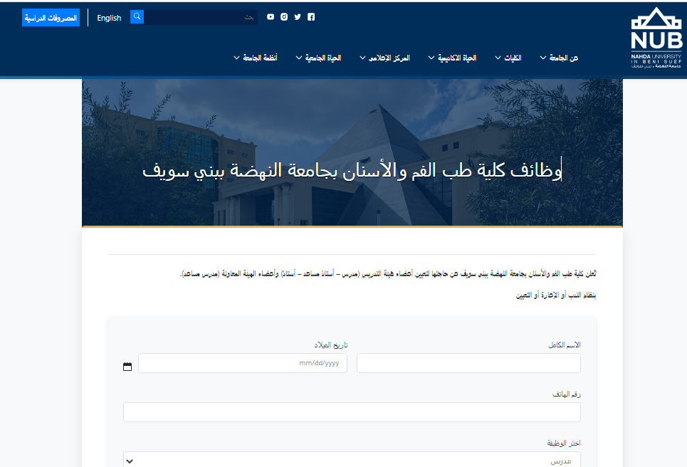 وظيفة جامعة.. أعلنت كلية طب الفم والأسنان بـ جامعة النهضة عن فتح باب التقديم لشغل عدد من الوظائف الأكاديمية لأعضاء هيئة التدريس والهيئة المعاونة، وذلك في إطار خطتها المستمرة لدعم الكفاءات العلمية وتعزيز جودة العملية التعليمية والبحثية داخل الكلية، بما يتماشى مع المعايير الأكاديمية المعتمدة من المجلس الأعلى للجامعات.