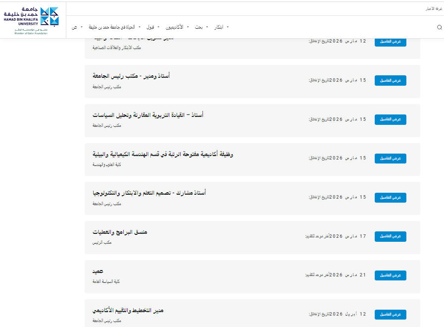 وشملت الإعلانات كذلك عددًا من الوظائف الإدارية المتخصصة، من بينها أخصائي إدارة الأداء الذي يُغلق باب التقديم له في السادس عشر من مايو 2026، وأخصائي النشر الأكاديمي بدار نشر جامعة حمد بن خليفة بتاريخ إغلاق السابع عشر من مايو 2026، وهي وظيفة ترتبط بتعزيز جودة الإنتاج العلمي والنشر الأكاديمي للجامعة. كما طرحت الجامعة وظيفة أخصائي القبول بمكتب رئيس الجامعة، إضافة إلى وظيفة مسؤول الامتثال المخصصة للمواطنين القطريين فقط بمكتب الرئيس، على أن يكون الثامن عشر من مايو 2026 هو آخر موعد للتقديم على الوظيفتين.