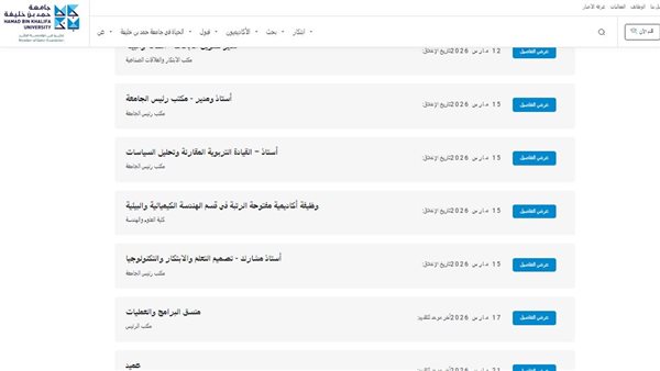 وظيفة جامعة.. أعلنت جامعة حمد بن خليفة عن طرح مجموعة جديدة من الوظائف الأكاديمية والإدارية للعام 2026، وذلك في إطار خطتها لتعزيز الكفاءات البحثية والإدارية ودعم منظومة التعليم العالي والبحث العلمي داخل المدينة التعليمية بالدوحة.