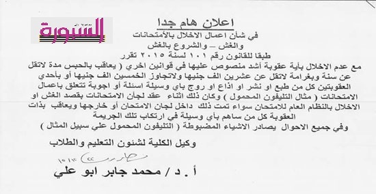 وأضاف خلال الإعلان الملصق بالكلية: "هذه العقوبة تطبق أثناء عقد لجان الامتحانات، ضد من يقصد الغش أو الإخلال بالنظام العام للامتحان، سواء تم ذلك داخل لجنة الامتحانات أو خارجها، ويعاقب بذات العقوبة كل من ساهم بأى وسيلة فى ارتكاب تلك الجريمة، وفى جميع الأحوال تصادر الأشياء المضبوطة للكلية".