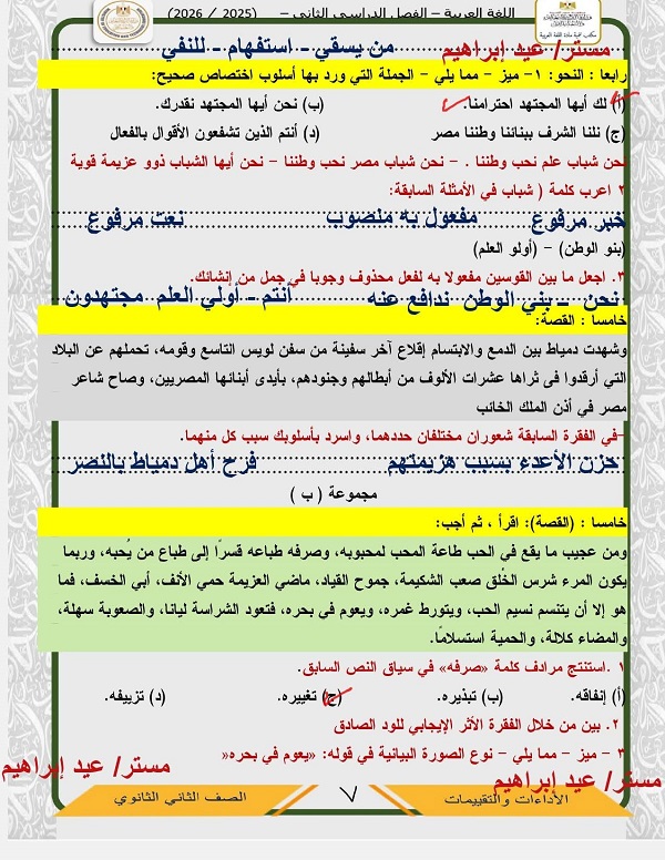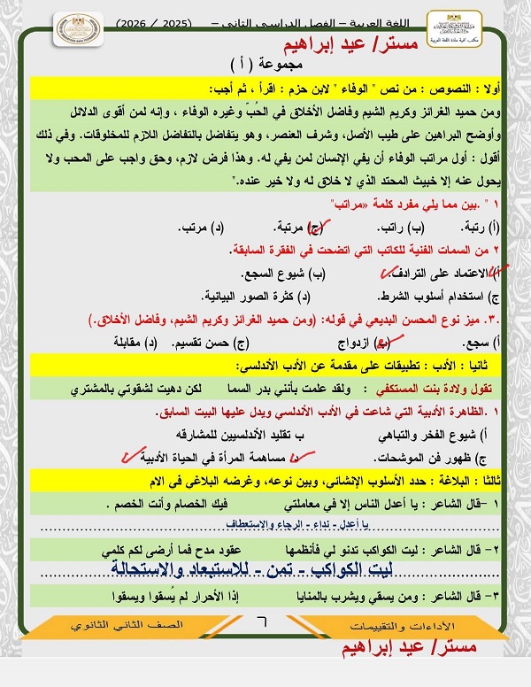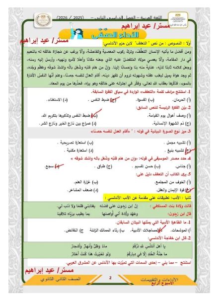 وتحميل أقوى أسئلة تقييمات الأسبوع الرابع العربي، تضمن لك دخول الامتحان وهو في جيبك، لطلاب وطالبات الصف الثاني الثانوي، من خلال امتحانات مادة اللغة العربية، تضمن لك مراجعات نهائية في منهج الفصل الدراسي الثاني، والتى تعد مرجعا أساسيا في مراجعات نهائية، لمقرر المنهج الدراسي للعام الدراسي الجاري 2025-2026، أعدها خبراء المادة في وزارة التربية والتعليم، من أجل مراجعات نهائيه لطلاب الصف الثاني الثانوي، وللدخول على تقييم الأسبوع الثالث من خلال هذا الرابط.. اضغط هناااااااااااا