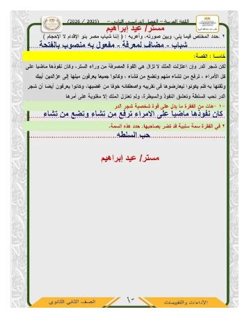 - حل التقييم الاسبوعي للصف الثاني الثانوي عربي الاسبوع الرابع المراجعات النهائية