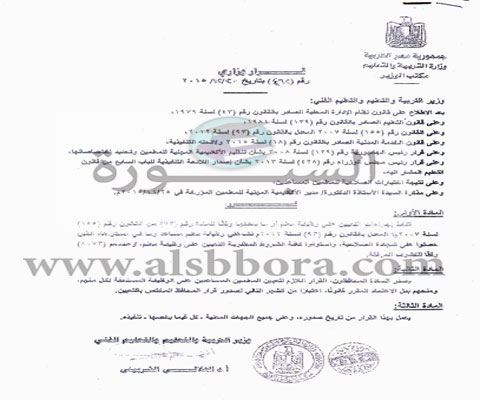 حصلت " السبورة " علي نص القرار الذي أصدر ه الدكتور الهلالى الشربينى وزير التربية والتعليم والتعليم الفنى ورئيس مجلس إدارة الأكاديمية المهنية للمعلمين ببتعيين 8073 معلم مساعد وما فى مستواه من المتعاقدين قبل وحتى 30/9/2013م فى وظيفة معلم وما فى مستواه ،