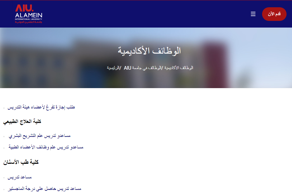 وظيفة جامعة.. أعلنت جامعة العلمين الدولية فتح باب التقديم لعدد من الوظائف الأكاديمية الشاغرة في كليتي العلاج الطبيعي وطب الأسنان، وذلك في إطار خطتها المستمرة لتعزيز الكوادر الأكاديمية وتطوير العملية التعليمية والبحثية داخل الجامعة.