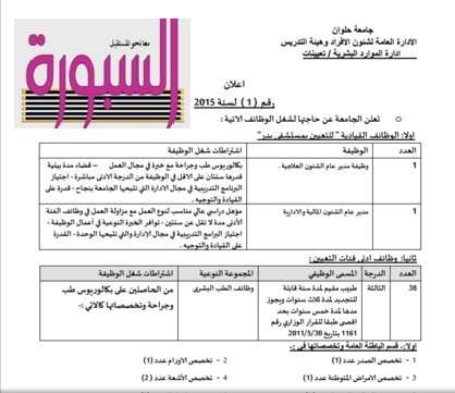 تعلن الهيئة العامة لشئون الافراد والتدريس بجامعة حلوان عن حاجتها لشغل عدد من الوظائف "طبيب، تمريض، شئون ادارية، اخصائى تمريض ، اخصائى علاقات عامة، وصيدلى اخصائى، احصاء، ومهندس، اخصائى شئون مالية، طبيب بشرى، اخصائى تعليم، اخصائى وثائق مكتبات، اخصائى نشاط اجتماعى، فنى زراعة وتغذيه،كاتب، خدمات معاونة.