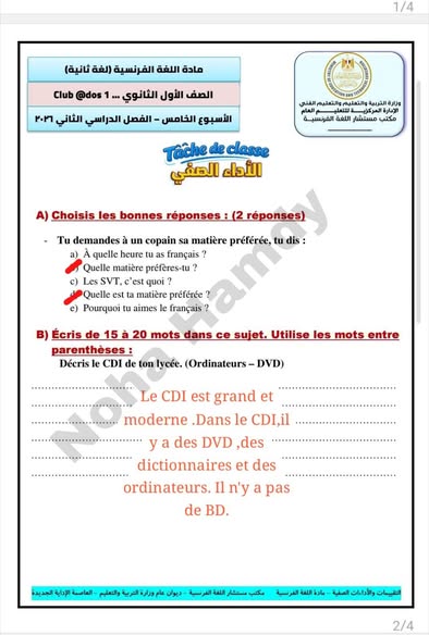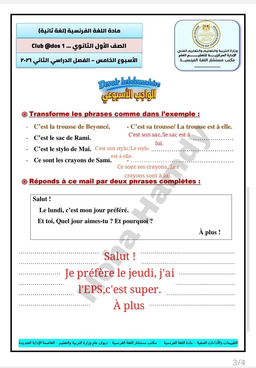 - حل التقييم الاسبوعي للصف الأول الثانوي الفرنساوي الأسبوع الخامس في اللغة الفرنسية