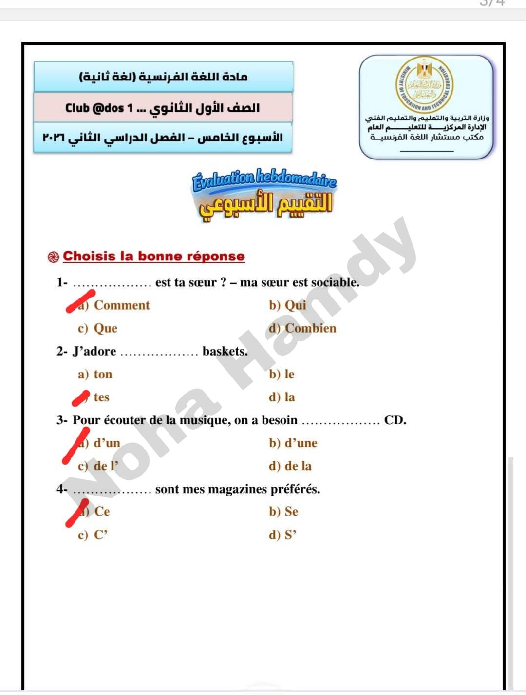 - نموذج تقييم الأسبوع الخامس فرنساوي بالاجابات