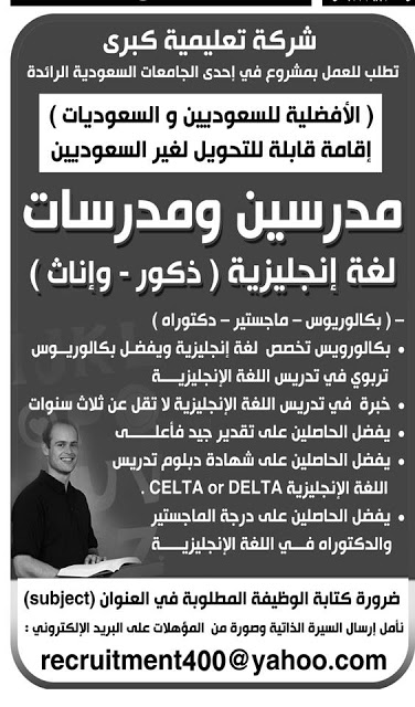 يفضل الحاصلين على درجة ماجيستير والدكتوراه فى اللغة الانجليزية