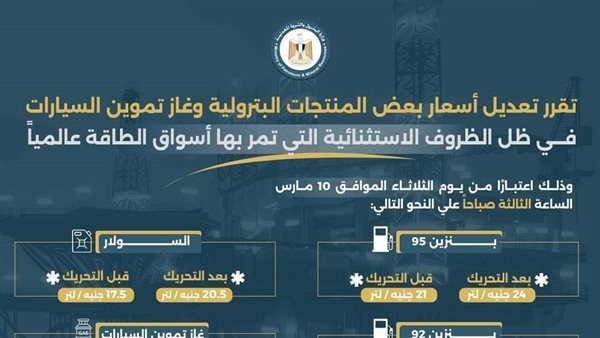 وتتابع الحكومة، ممثلة في وزارة البترول والثروة المعدنية، تطورات الأسواق العالمية وتكلفة الطاقة بشكل مستمر، في إطار العمل على ضمان استدامة إمدادات المنتجات البترولية والغاز الطبيعي للمواطنين ولجميع قطاعات الدولة. كما تؤكد الجهات المعنية أن أي إجراءات استثنائية يتم اتخاذها تأتي ضمن إدارة مسؤولة للتحديات الاقتصادية الدولية الراهنة، مع الحفاظ على أمن الطاقة واستقرار السوق المحلي باعتباره أولوية أساسية.