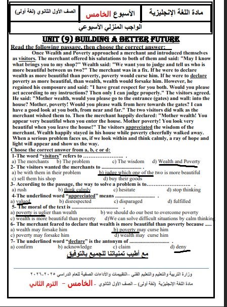 - مراجعة Unit 9 Building a Better Future أولى ثانوي