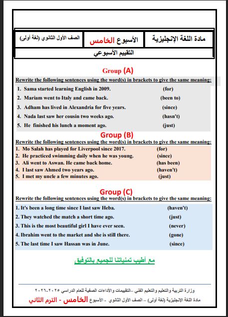 - حل تقييم الأسبوع الخامس إنجليزي أولى ثانوي 2026
