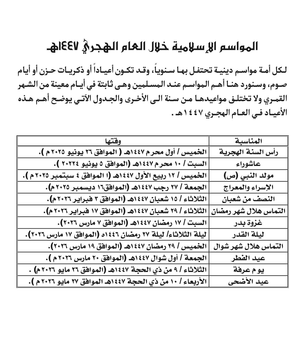 الأربعاء / 10 من ذي الحجة 1447 هـ (الموافق 27 مايو 2026 م ).