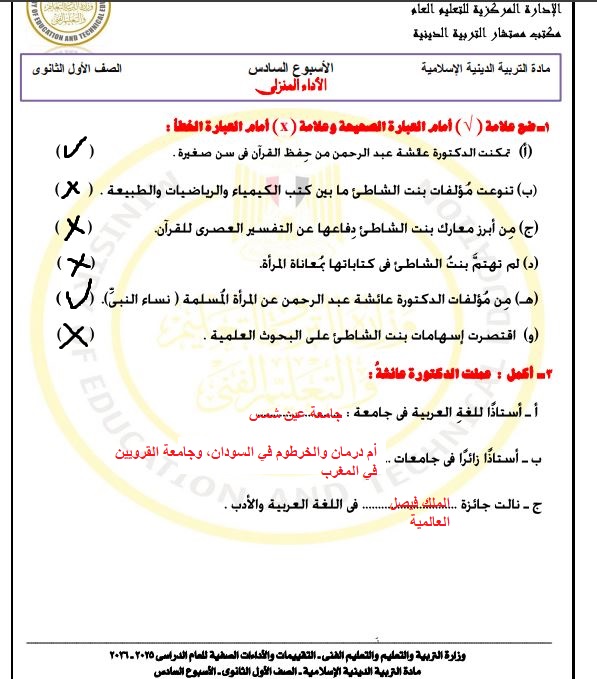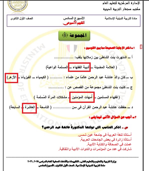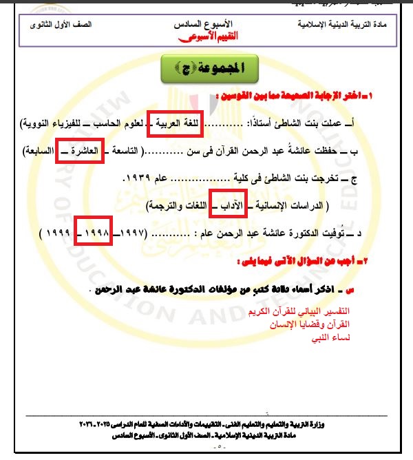 - إجابات تقييم الأسبوع السادس تربية إسلامية الصف الأول الثانوي ترم ثاني