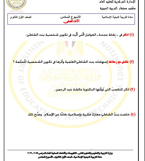 - أسئلة تقييم الأسبوع السادس تربية إسلامية أولى ثانوي بالإجابات