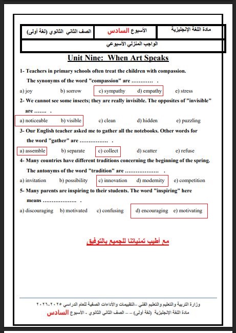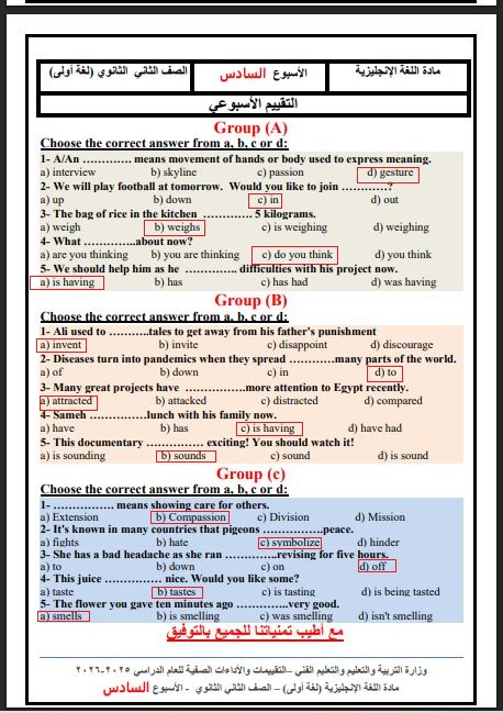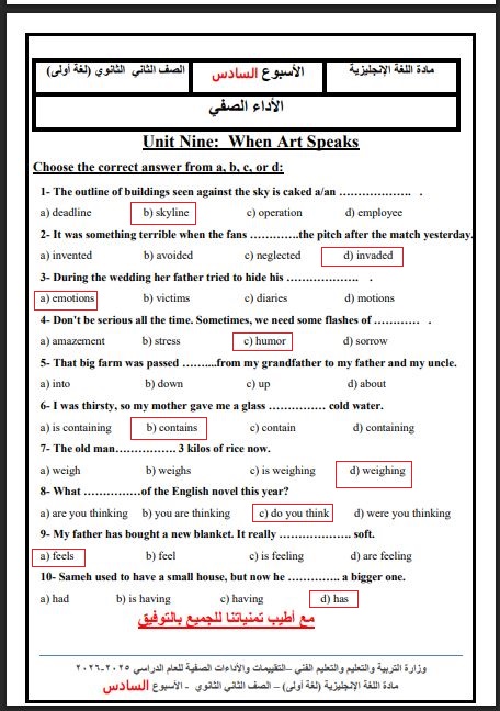 - إجابات الأسبوع السادس انجليزي ثانية ثانوي 2026