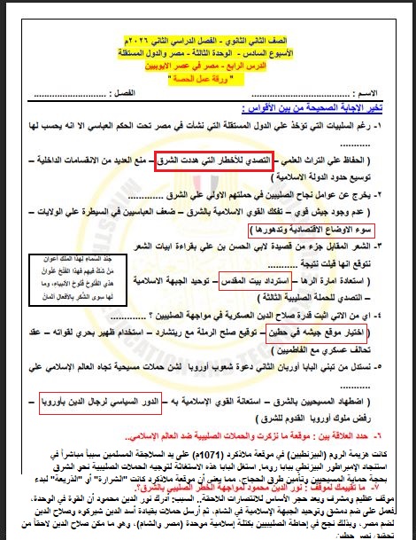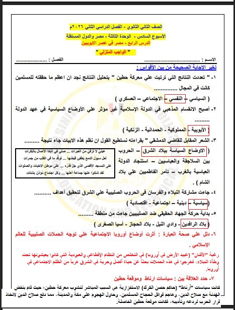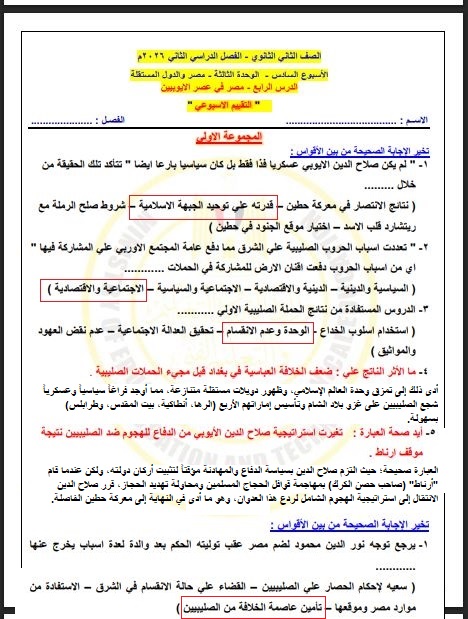 - تقييم الأسبوع السادس تاريخ تانية ثانوي 2026