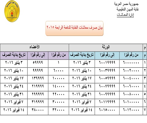 وأشار نقيب المعلمين إلى أنه سيتم صرف معاشات النقابة للدفعة الرابعة طبقاً للرقم الكودى الصغير الموجود على الفيزا كارد وفق جدول زمنى قصير جداً سيتم الإعلان عنه .