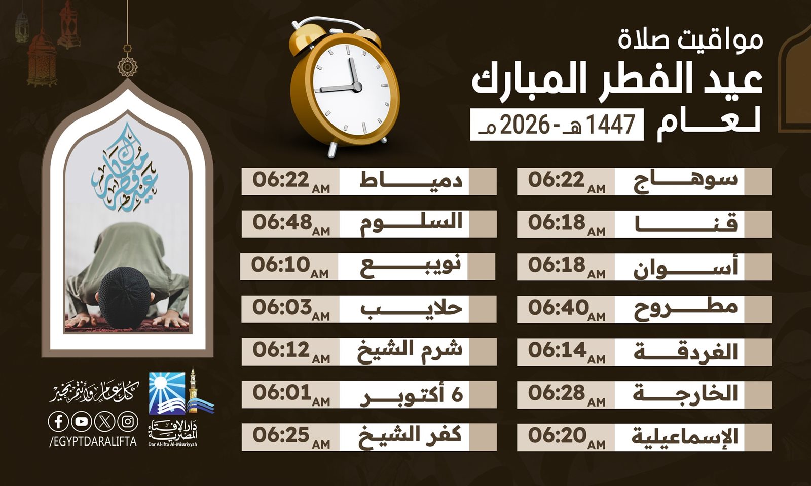 أما في محافظات الصعيد، فتقام الصلاة في أسيوط عند الساعة 6:24 صباحًا، وسوهاج 6:22 صباحًا، وقنا وأسوان 6:18 صباحًا، بينما تكون في المنيا والفيوم 6:26 صباحًا، وبني سويف 6:25 صباحًا.