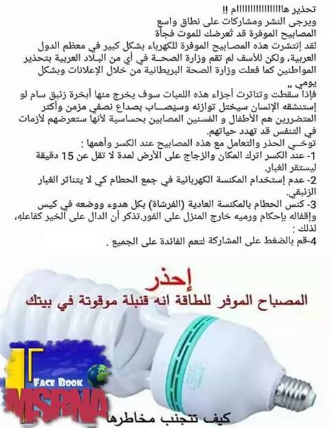 * في حال تعرض اللمبات للكسر: هناك مجموعة من الإجراءات يجب اتباعها للوقاية من أي أضرار قد يسببها تسرب الزئبق.