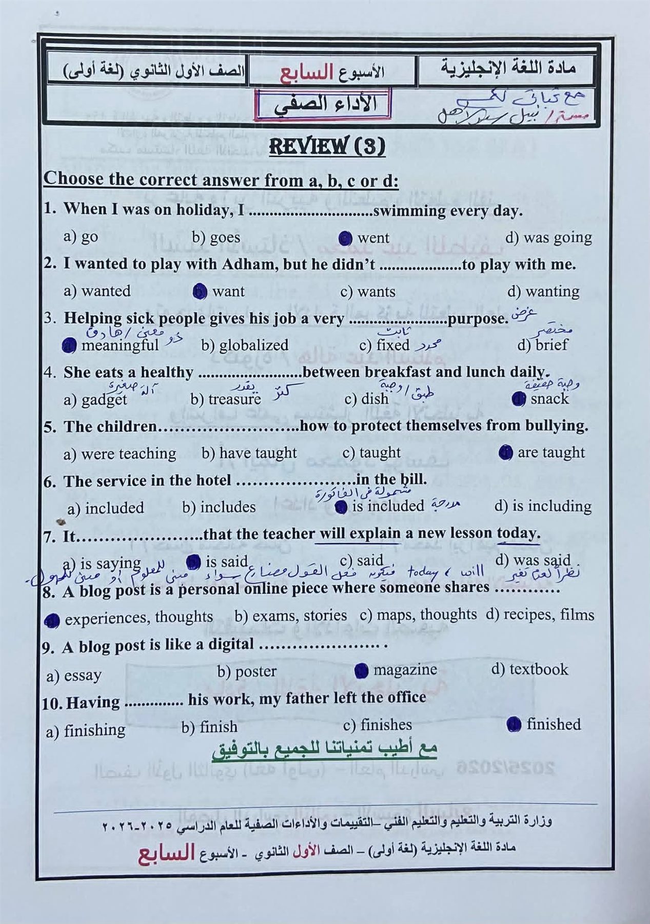 بالاجابات أسئلة الأسبوع السابع إنجليزي.. وتحميل أقوى اسئلة تقييم اللغة الإنجليزية في الأسبوع السابع، تضمن لك دخول الامتحان وهو في جيبك، لطلاب وطالبات الصف الأول الثانوي، من خلال امتحانات مادة اللغة الإنجليزية، تضمن لك مراجعات نهائية في منهج الفصل الدراسي الثاني، والتى تعد مرجعا أساسيا في مراجعات نهائية، لمقرر المنهج الدراسي للعام الدراسي الجاري 2025-2026، أعدها خبراء المادة في وزارة التربية والتعليم، من أجل مراجعات نهائيه لطلاب الصف الأول الثانوي.