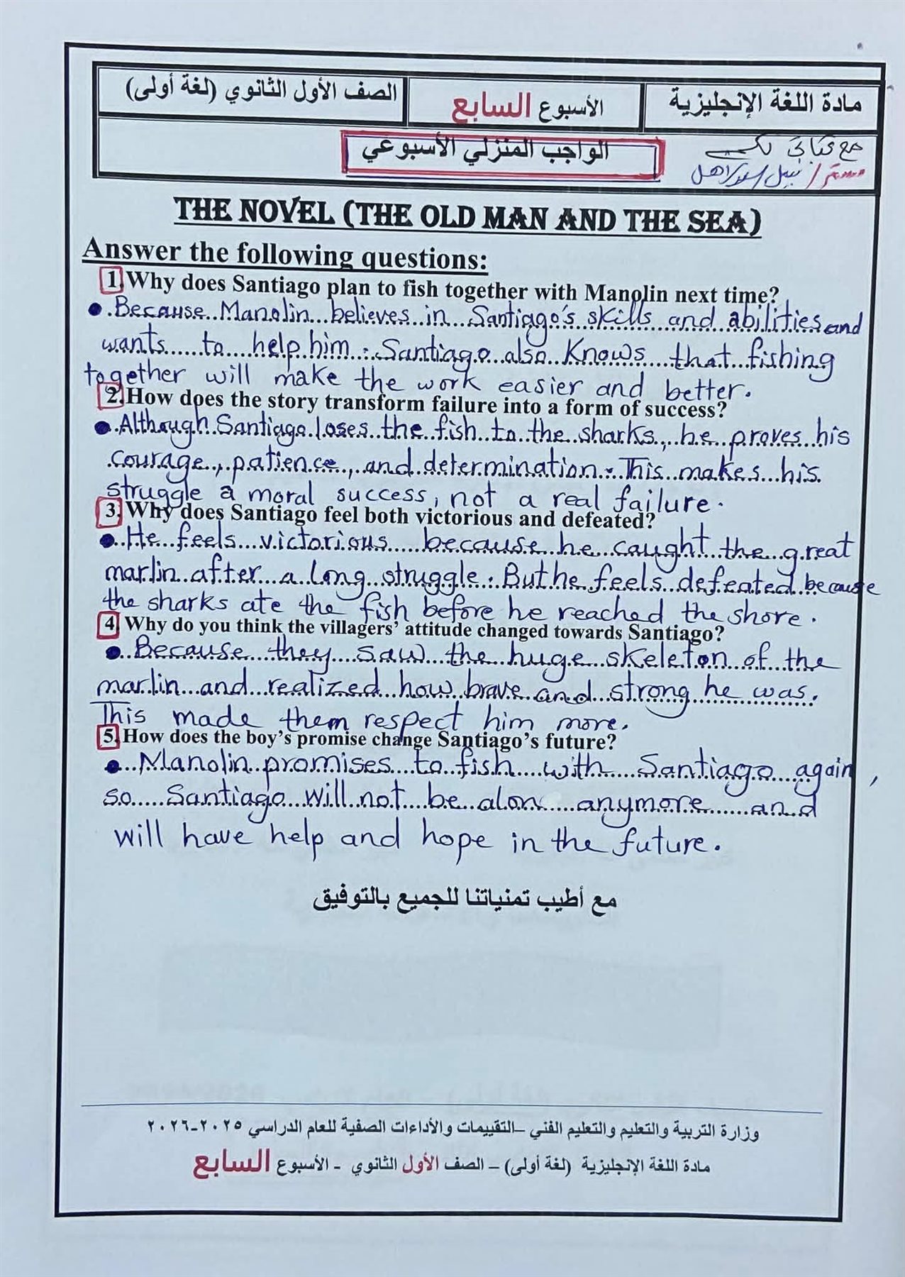لطلاب أولى ثانوي.. بالاجابات أسئلة الأسبوع السابع إنجليزي الترم الثاني