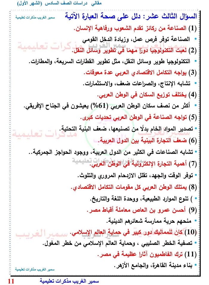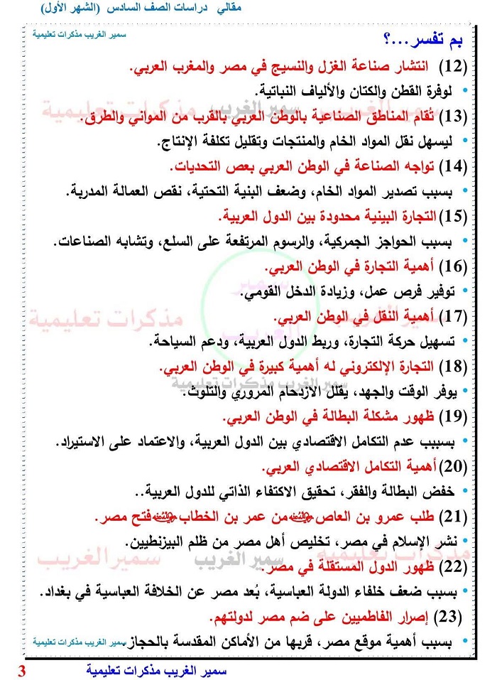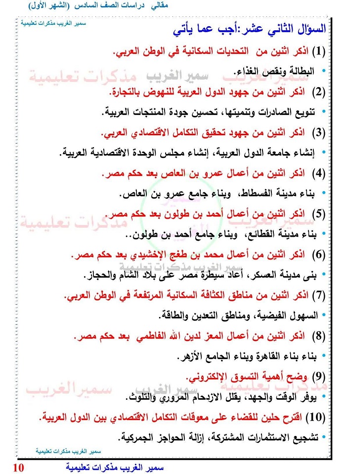 120 سؤالا مقاليا بالاجابات في الدراسات الصف السادس الابتدائي