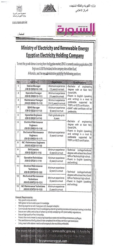 مطلوب 300 مهندس جميع التخصصات ” كهربا، ميكانيكا، مدني، معمارى، اتصالات، تخطيط، وتخصصات آخري، بشرط الحصول على تقدير عام جيد، ومشترك بنقابه المهندسين.