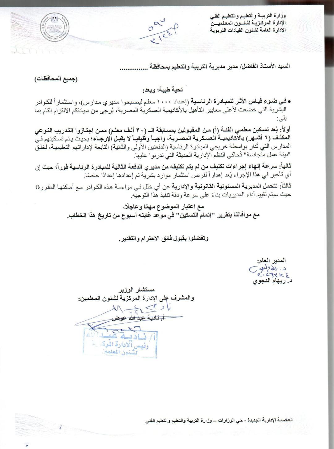 التعليم تُلزم المديريات بسرعة تسكين معلمي مبادرة إعداد 1000 مدير مدرسة.. مستند