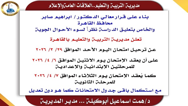 ضمن تداعيات تعليق الدراسة اليوم، قررت الدكتورة همت إسماعيل أبو كيلة، مدير مديرية التربية والتعليم بالقاهرة، ترحيل امتحان الأحد 29 مارس 2026، ليُعقد للمرحلتين الابتدائية والإعدادية يوم الإثنين 6 أبريل 2026، بينما تُعقد امتحانات المرحلة الثانوية يوم الثلاثاء 7 أبريل 2026، مع التأكيد على أن جدول الامتحانات الرسمي سيستمر دون أي تعديل آخر.