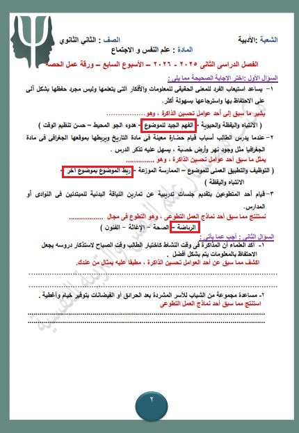 أسئلة وإجابات الأسبوع السابع علم النفس.. شهدت محركات البحث خلال الأيام الأخيرة ارتفاعًا ملحوظًا في عمليات البحث عن حل أسئلة تقييم الأسبوع السابع في مادة علم النفس والاجتماع للصف الثاني الثانوي ترم ثاني 2026، مع اقتراب الامتحانات الشهرية ورغبة الطلاب في مراجعة الدروس بشكل شامل والتأكد من صحة الإجابات.