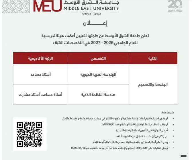 وظيفة جامعه.. وعلى الراغبين في الحصول على وظائف جامعة الشرق الأوسط،، ارسال الطلبات على OR Code المرفق بالإعلان، علما بأن آخر موعد للتقديم هو 2026/04/16.. ولمزيد من التفاصيل على وظائف جامعة الشرق الأوسط من خلال هذا الرابط.. اضغط هنااااااا..