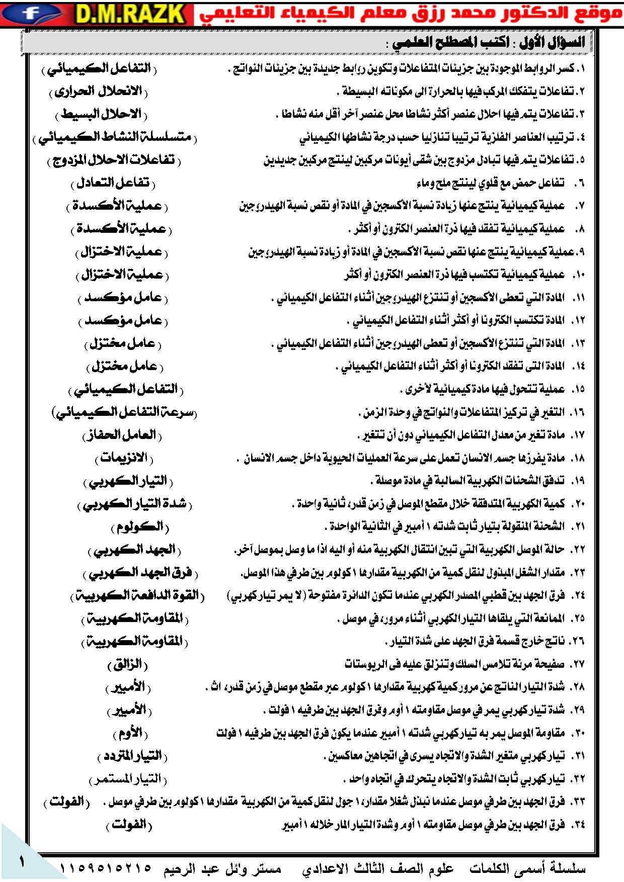 - تجميع أسئلة علوم الصف الثالث الإعدادي
