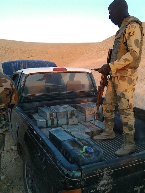 حيث تم العثور بداخله على عدد (32) شيكارة من مادة TNT شديدة الإنفجار ( فى صورتها الأولية ) بإجمالى وزن (1,5) طن وعدد (2465) طلقة عيار نصف بوصة وعدد (92) طلقة عيار (14,5مم وعدد (2000) لتر بنزين.