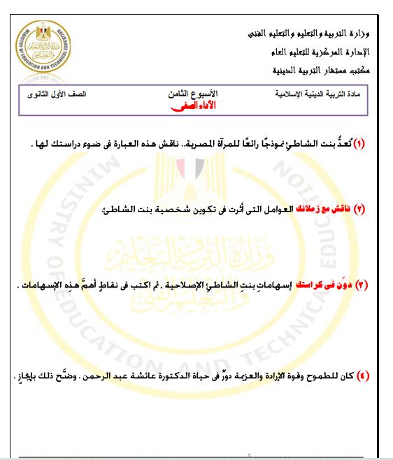 - تقييم الأسبوع الثامن تربية إسلامية أولى ثانوي