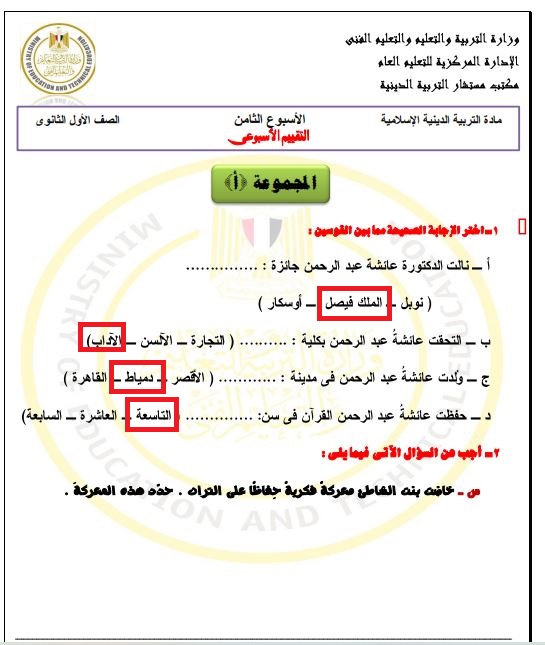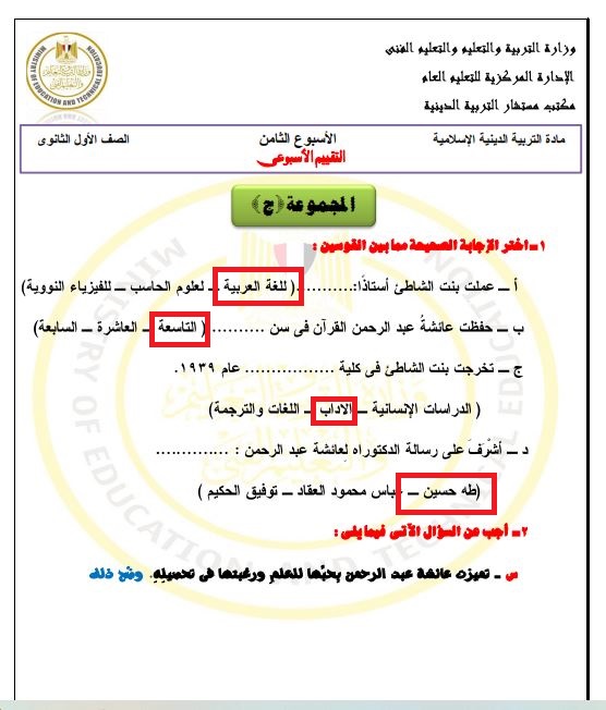 - إجابات تقييم الأسبوع الثامن ديني