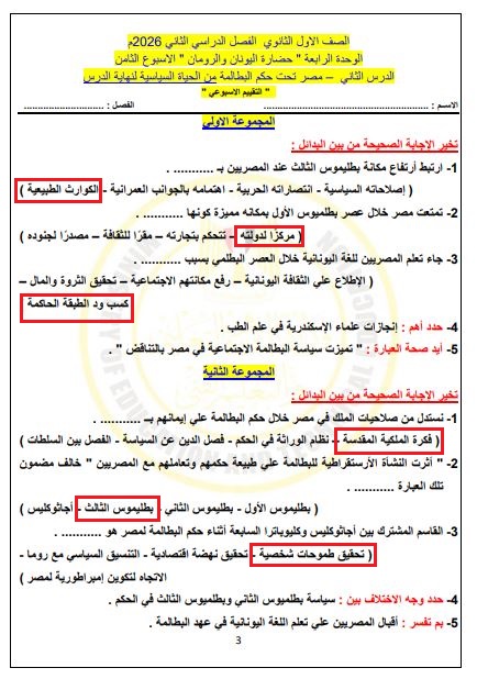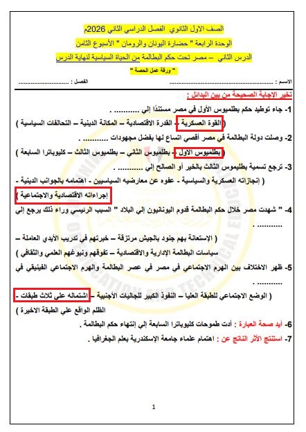 حل تقييم الأسبوع السابع في التاريخ أولى ثانوي ترم ثاني 2026.. مراجعة مهمة بالإجابات