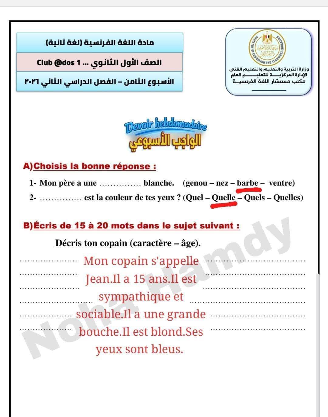 حل تقييم الاسبوع السابع لغة فرنسية الصف الأول الثانوي ترم ثاني.. مراجعة شاملة ونماذج إجابات