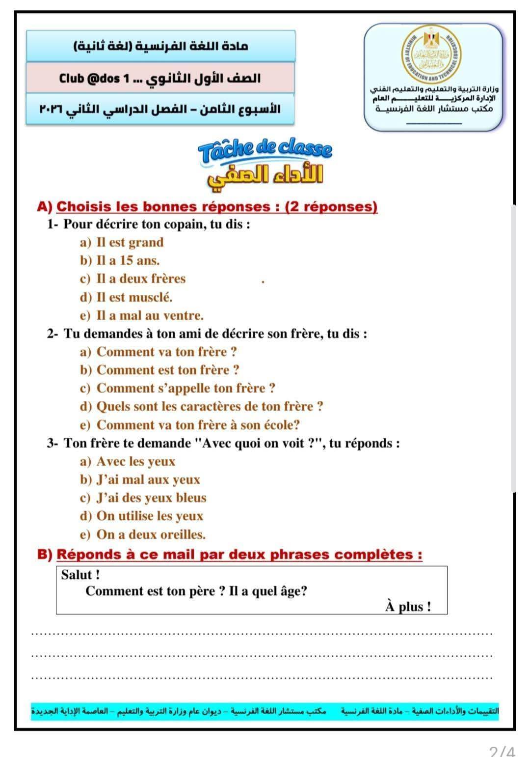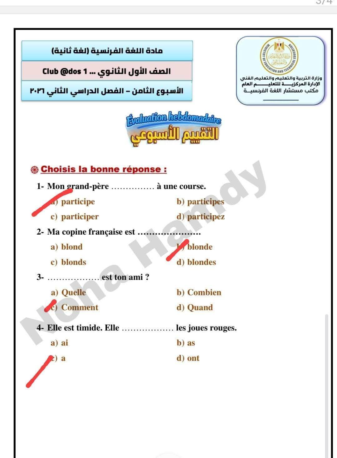 - إجابات تقييم الفرنساوي ترم ثاني 2026