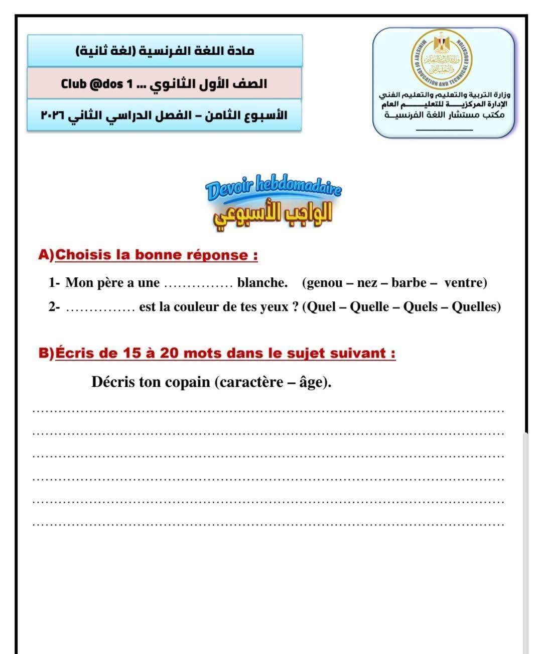 - تقييم الأسبوع الثامن لغة فرنسية الصف الأول الثانوي