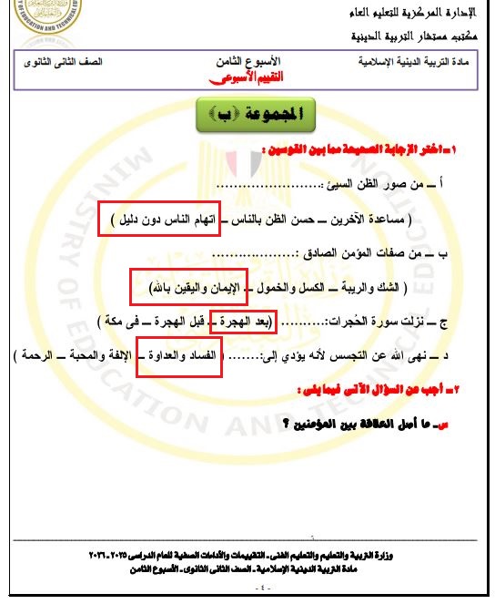 تقييم الأسبوع التاسع التربية الإسلامية ترم ثاني ثانية ثانوي.. ويُعد نموذج إجابات تقييم الأسبوع التاسع في التربية الإسلامية من أهم أدوات المراجعة التي يعتمد عليها الطلاب خلال هذه المرحلة، خاصة مع اقتراب الامتحانات وحرص الجميع على تحقيق أفضل النتائج.