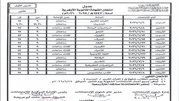 أما طلاب القسم العلمي، فمن المقرر أن تنطلق امتحاناتهم يوم السبت 6 يونيو 2026، أيضًا بمادتي القرآن الكريم والحديث الشريف، على أن تستمر حتى يوم الأربعاء 8 يوليو 2026، حيث تختتم الامتحانات بمادة الأدب والنصوص.